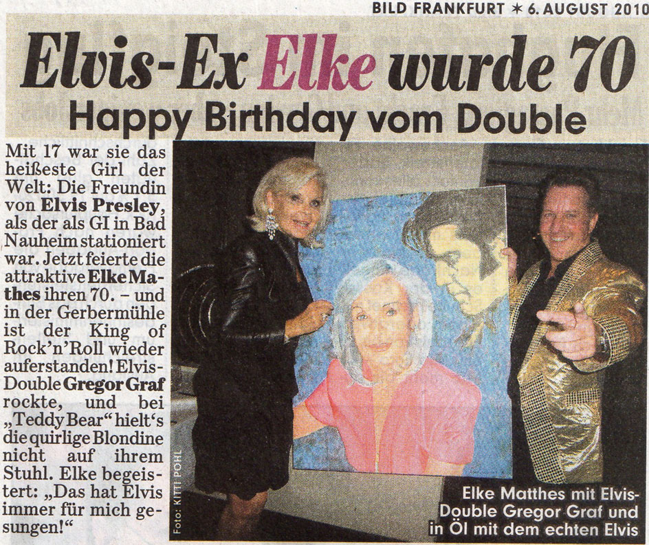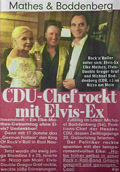 Bericht Horst Reber: Elvis ist und bleibt unsterblich. Zumindest für das Millionenpotential an Anhängern, die nach wie entzückt mit den Gliedern zucken, wenn alte Titel des US-Weltstars irgendwo zu hören sind. Elke Mathes, ehemalige führende Modelady der Stadt Stadt Frankfurt, deren Boutique "New Lady" stets die neuesten Trends zwischen Paris, Mailand oder New York offerierte, erfüllte sich zu ihrem 75. Geburtstag im "Main-Nizza" mit ihren Gästen einen nie erlahmenden Herzenswunsch: Ein Elvis-Imitator - in diesem Fall mit Gregor Graf, der zu den besten Song-Kopisten dieses Genres gehört - stand plötzlich nach dem 3. Essensgang am Geburtstagstisch und ließ in Goldener Show-Montur alte Titel hören. "Love me tender", "Love me true". Alle anderen Gäste im Lokal legten Löffel und Gabel beiseite und strahlten ob der wilkomenen Show-Überraschung. Und Elke Mathes, die als 16jährige Schülerin in Bad Nauheim das große Erlebnisglück hatte, Elvis mit ihren Schulfreundinnen öfter mal in jener Zeit zu treffen, als Elvis Presley in Friedberg bei der US-Army seinen Wehrdienst absolvierte, war ebenfalls happy. Elvis spielte in ihrem erfolgreichen Leben als Geschäftsfrau musikalisch immer eine sympathische Rolle. "Die Erinnerung an jene Zeit ist für mich Gold wert", sagte sie und mußte gleich im Kreis der Gratulanten noch mehr erzählen. Einer der Gäste am Nebentisch, der auch gleich zum Gratulieren rüber kam, war an diesem Abend übrigens Michael Boddenberg, 56jähriger CDU-Fraktionschef im hessischen Landtag und seit vielen Jahren glücklich in Frankfurt-Sachsenhausen zu Hause. Der besonders auch in der Stadt Frankfurt und der Handwerkerschaft ob seiner verbindlichen Art und seines bürgerlichen Engagements überparteilich hoch angesehene Politiker, hatte mit seiner Frau Sylvia, Mitinhaberin der schon 1949 vom sächsischen Großvater gegründeten Frankfurter Fleischer- und Bäckerfachschule Jürgen A. Heyne GmbH & Co. KG, die danach von Handwerkskammer-Ehrenpräsident Jürgen A. Heyne zur Blüte mit inzwischen